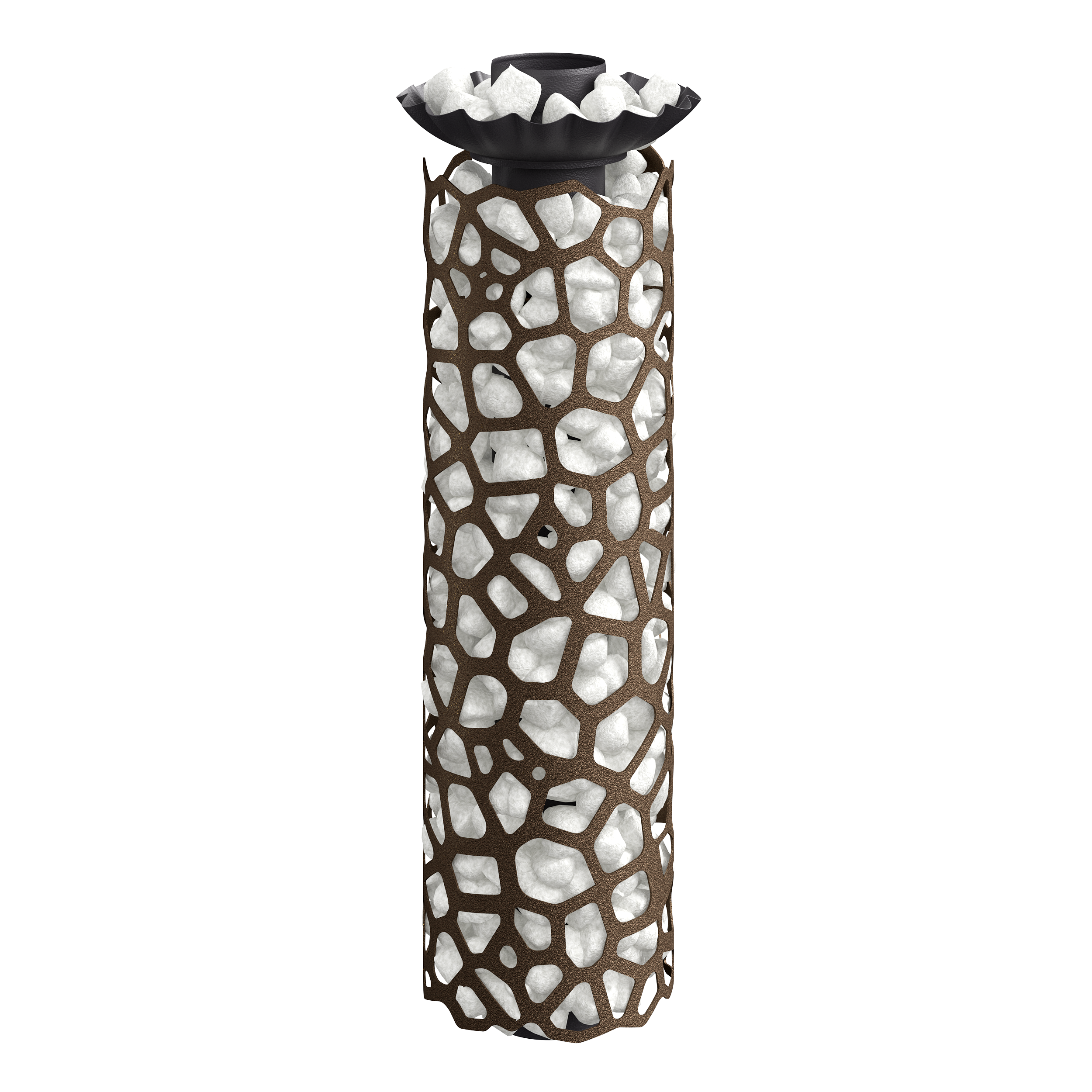 Дизайн каменки хорошо узнаваем — это сетка Вороного, которая создаёт ощущение лёгкости и воздушности. Кожух натрубной каменки окрашен в цвет «Чёрная бронза», поэтому для увеличения контраста рекомендуется каменная закладка из белого кварца.